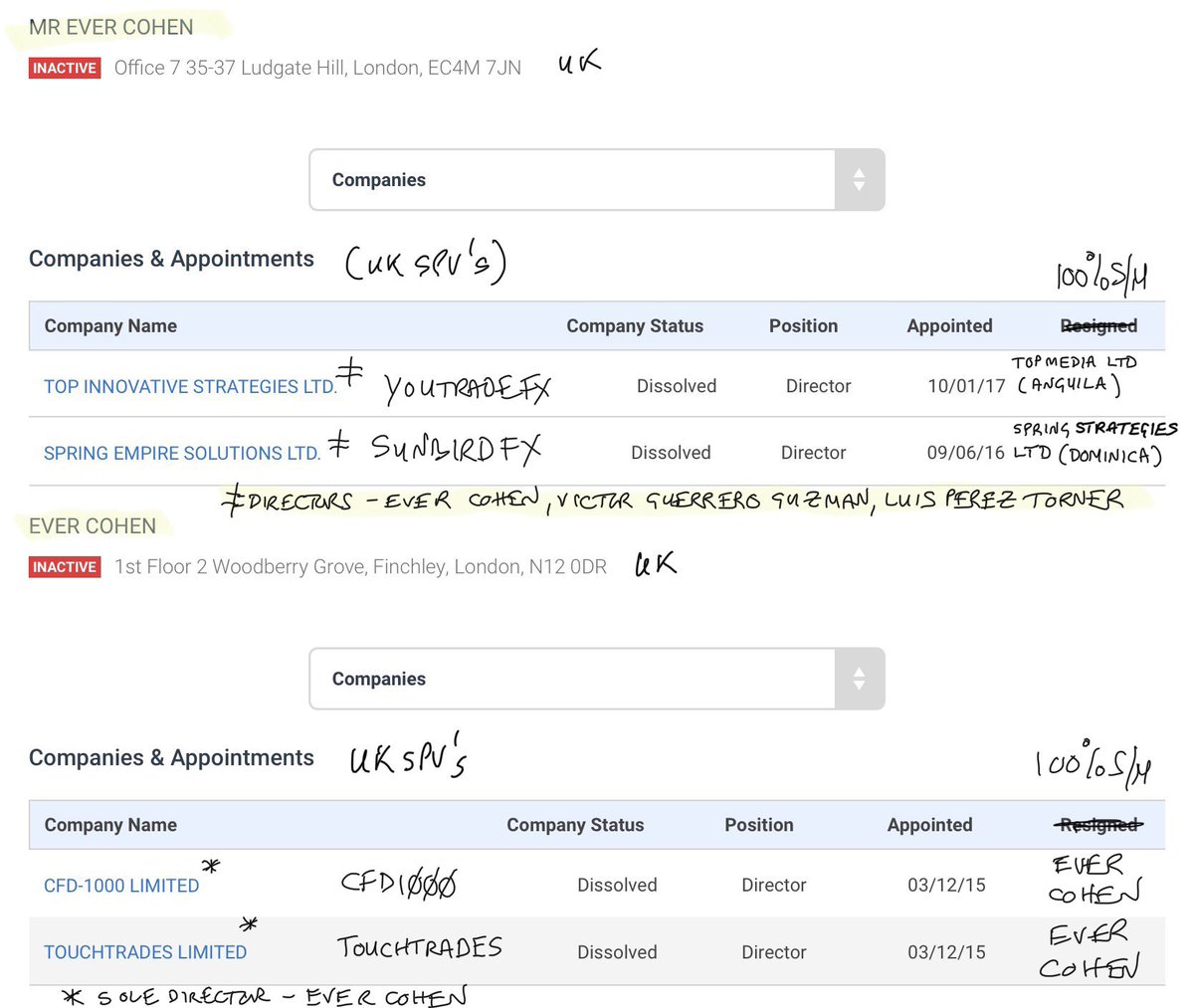 25/ director is another purported Mexican national Luis Felipe Perez Torner who is one of a threesome with Ever Cohen & Victor Guzman at UK SPV Spring Empire Solutions Ltd (SUNBIRDFX) - #Zoobroker scam network .. a small world indeed. Lots of blacklisted crypto/binary option ...