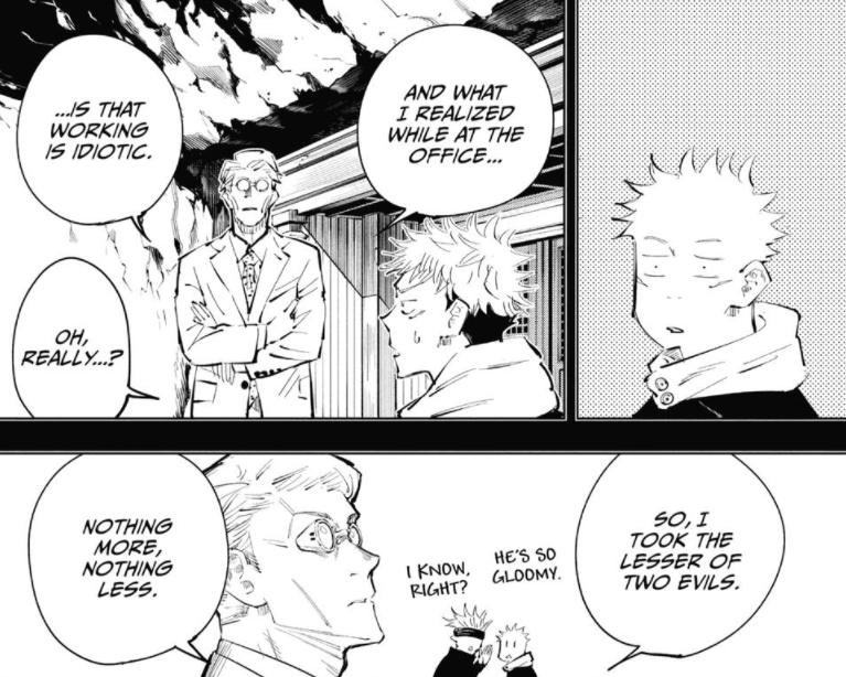 However, Gege creates a character that rejects the businessman's lifestyle after coming to the realization that the world of a sorcerer is a lesser evil. With his experiences in both spheres, Nanami Kento is dubbed as reliable by Gojo