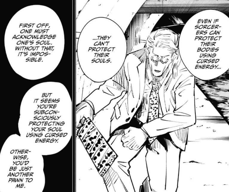 Nanami, someone who conceals his being from others, and Mahito, who can see through others via the soul. A very impactful dichotomy that shows itself. The first time Mahito touched Nanami he wasn't able to transfigure him because Nanami was unconsciously protecting his soul.