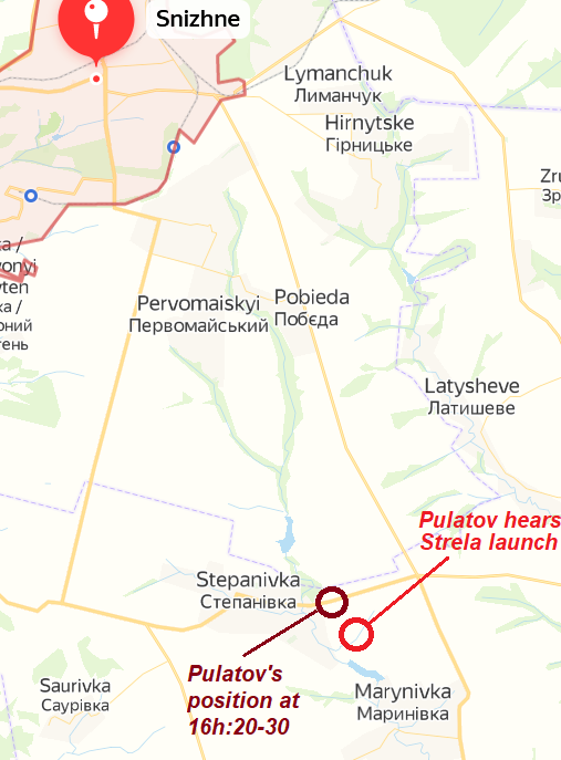 As said in thread Pulatov was in Marinovka according to an intercepted call. He steppend into a car when he heard a Strela launch when he was at about 2 km North-West from this village, as he testifies in his videostatement.