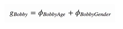Sebagai contoh, ada seorang bernama Frank yang bekerja sebagai penguji game dan memiliki usia 50 tahun, dia suka dengan game komputer, Maka, Frank akan memiliki koefisien ϕ_Job yang tinggi, sedangkan koefisien ϕ_Age akan rendah.