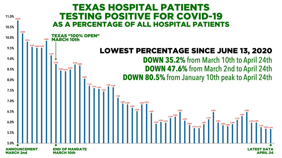 According to @TexasDSHS data, the number of patients in Texas hospitals who also tested positive for COVID-19: down 35.5% since Texas reopened "100%" without a statewide mask mandate.