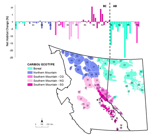For 48 of 70 herds in BC and Alberta, caribou habitat is being lost faster than it is regrowing. This includes things like forestry, wildfire and other major forest cover loss. At least seven caribou ranges have lost nearly a quarter of their habitat.