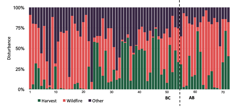 The predominant type of disturbance is variable by range. Forestry and wildfire are major players - as well as LFs in some areas (particularly the boreal from oil and gas exploration).