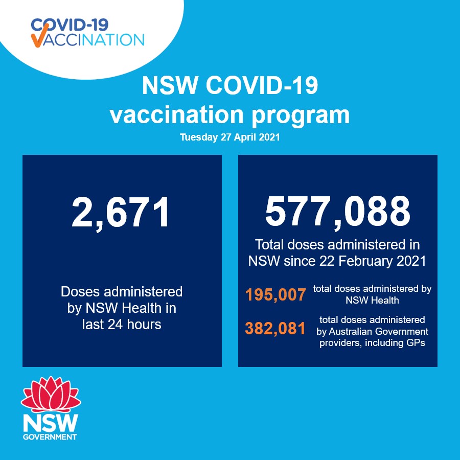 NSW Health administered 2,671 vaccines in the 24 hours to 8pm last night. The total number of vaccines administered in NSW is now 577,088, with 195,007 doses administered by...