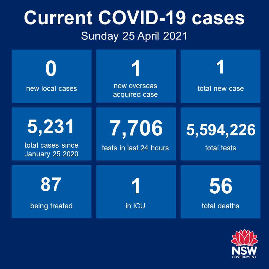 One new case was acquired overseas to 8pm last night, bringing the total number of cases in NSW since the beginning of the pandemic to 5,231.