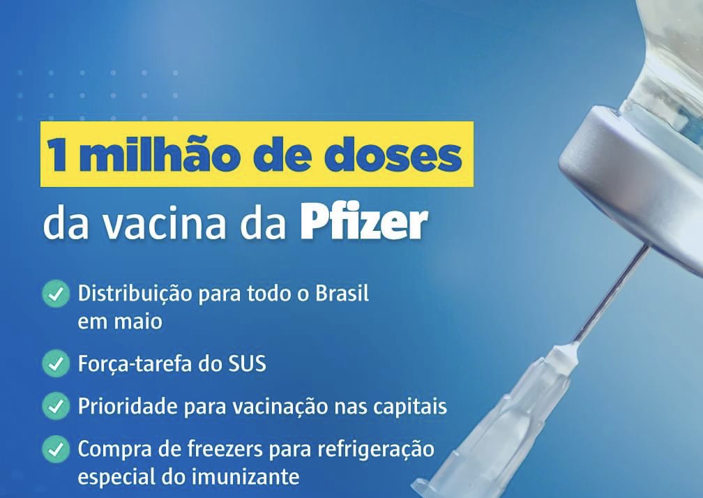 A1. Fora as entregas semanais de outras vacinas, vem aí o 1º lote da Pfizer com 1 milhão de doses! O @govbr tem um acordo fechado com a Pfizer de 100 milhões de doses no total. A expectativa é que 15,5 milhões de doses cheguem até junho, e o restante até o fim de 2021. @minsaude