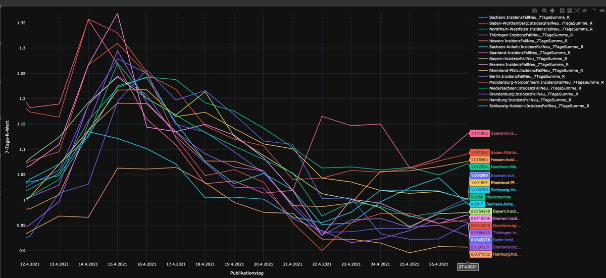 Hier die 7-Tage-R-Werte in den Bundesländern. Saarland, Baden-Württemberg und Hessen über 1, Rest bei 1 oder darunter. Kein Land unter 0,9, nur 2 unter 0,95. Sieht nicht nach baldigen Lockerungen aus.