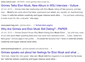 “Though last fall it seemed their relationship might be on the rocks, a March (2019) interview that Grimes, born Claire Boucher, gave to the Wall Street Journal’s magazine showed that the two are still together.”