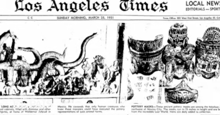 6. ‘Enigmas del pasado’, el panfleto de Julsrud, traspasó fronteras. En marzo de 1951, la portada local de Los Angeles Times abría con tres fotos de la colección de dinosaurios: “Hallazgos de México dan indicios de un mundo perdido” bit.ly/2SegGsr