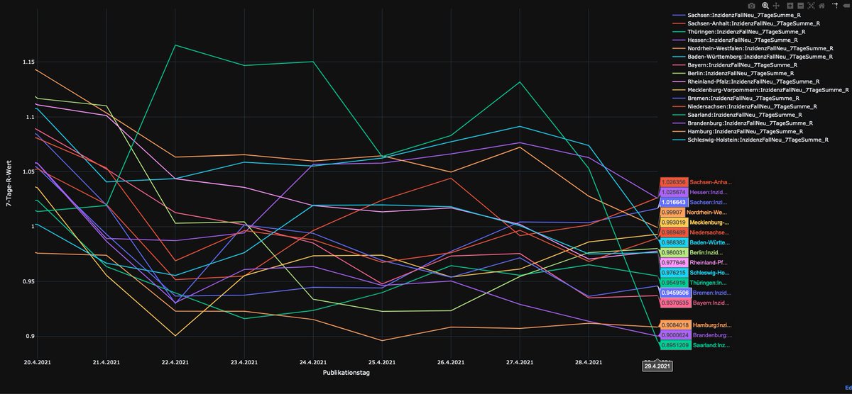 Hier die Inzidenzen der Bundesländer: Thüringen (244, blau) und Sachsen (241, rot) gehen zurück, Saarland (grün) und Baden Württemberg mit Anstiegen.
