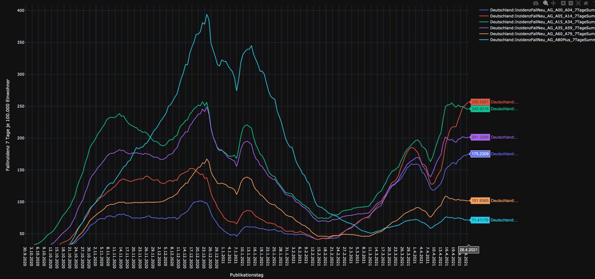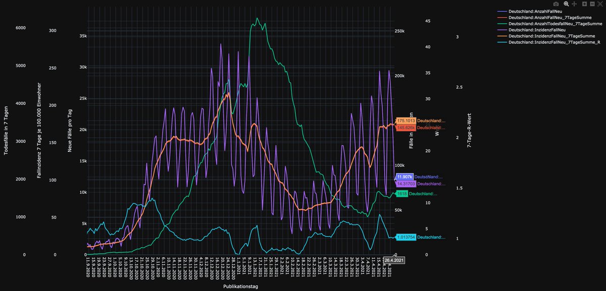Aktuelle Corona-Lage 26.4.2021: Unveränderte Seitwärtsbewegung bei 7-Tage Inzidenz 175/100.000, (offiziell 169 nach Meldetag) R-Wert 1,01. Todesfälle: 1648 in 7 Tagen.