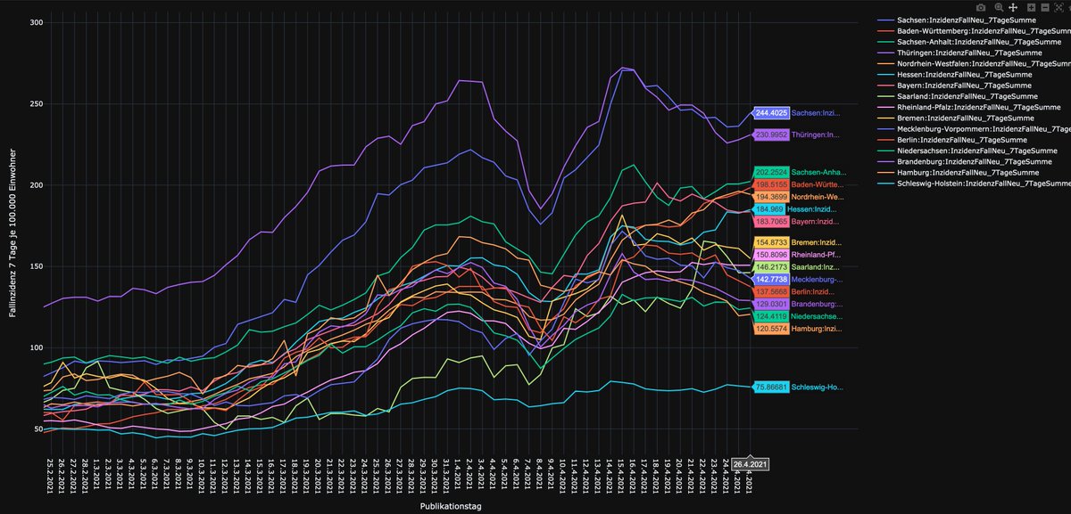 Hier die Inzidenzen der Bundesländer: Thüringen (244, blau) und Sachsen (241, rot) gehen zurück, Saarland (grün) und Baden Württemberg mit Anstiegen.