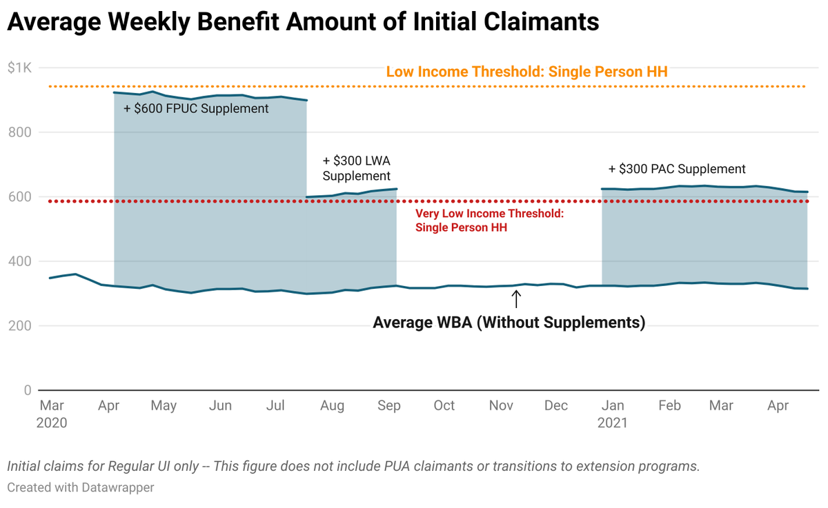 4) The UI system was not designed with low-wage workers in mind. In CA, weekly benefit amounts are just half of prior earnings & top out at $450 - well below poverty levels.