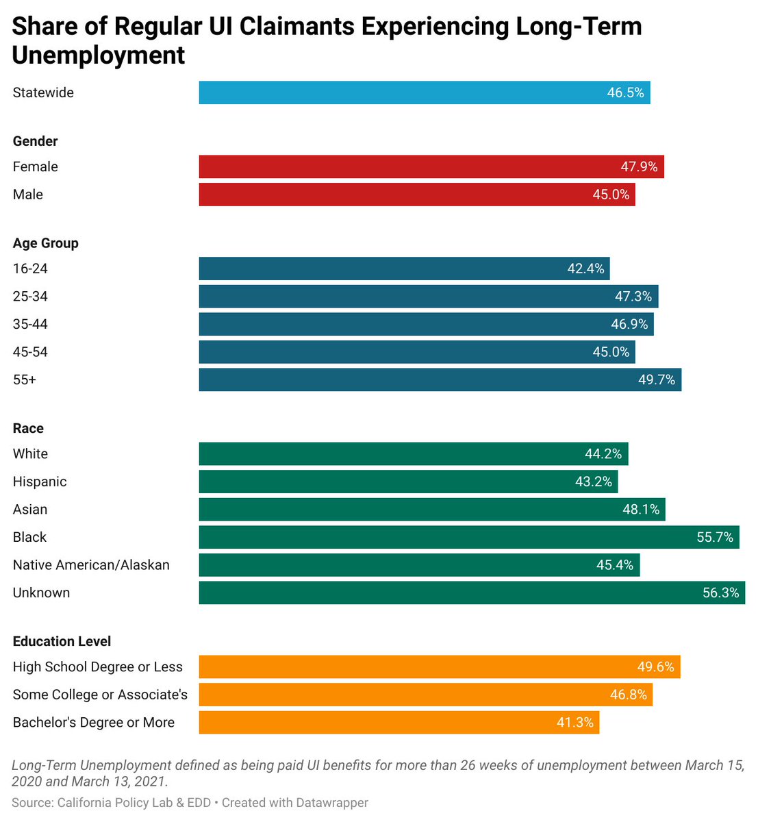 Of the individuals claiming regular UI benefits: Black claimants, lower educated claimants, and female claimants were more likely to experience LTU.