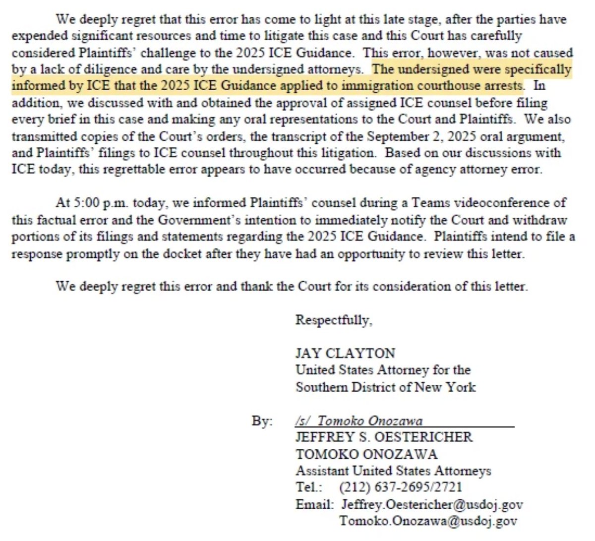 "This error, however, is not caused by a lack of diligence and care by the undersigned attorneys. The undersigned were specifically informed by ICE that the 2025 ICE Guidance applied to immigration courthouse arrests."