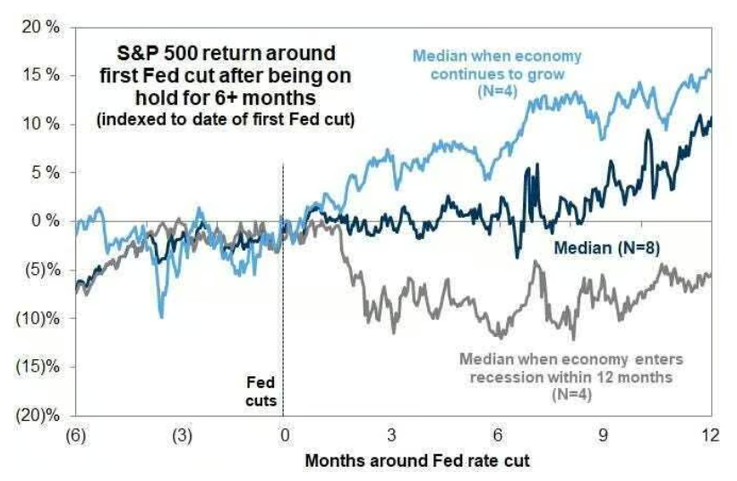 3/ Septiembre se espera que sea el mes de las bajadas de tipos... Generalmente el S&P500 tiende a comportarse bien tras ellas, aunque mucho mejor si no hay recesión: