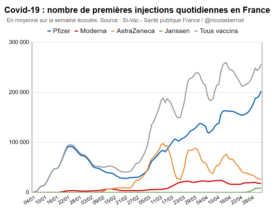 Seules 10% des personnes vaccinées pour la première fois chaque jour (en moyenne sur la semaine écoulée) reçoivent désormais de l'#AstraZeneca.