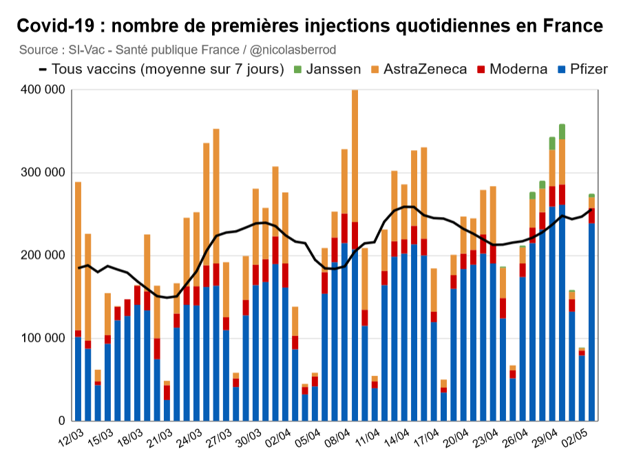 Pour les 20 millions le 15 mai, tout pourrait se jouer ce samedi et jeudi prochain. Si peu de vaccinations étaient réalisées ces deux jours fériés, cela risquerait de trop compenser de grosses journées entre-temps. #Macron l'a d'ailleurs bien compris.