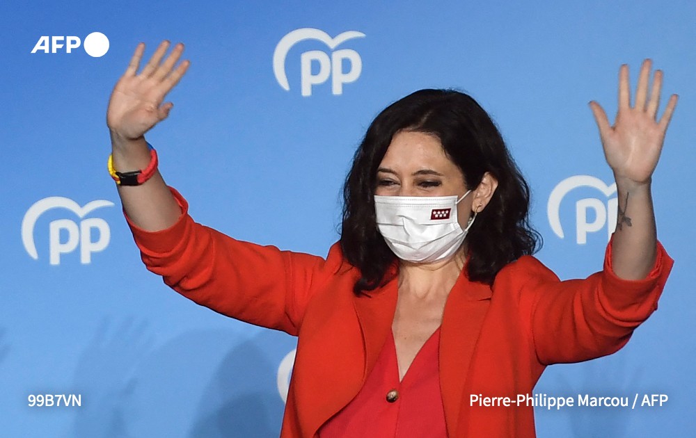 [À LA UNE À MIDI] La droite espagnole et sa figure montante, Isabel Díaz Ayuso, ont triomphé aux élections régionales à Madrid, un revers pour le Premier ministre socialiste Pedro Sanchez et son allié Podemos, dont le chef Pablo Iglesias se retire de la vie politique #AFP 3/5