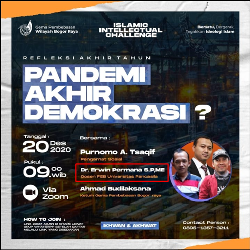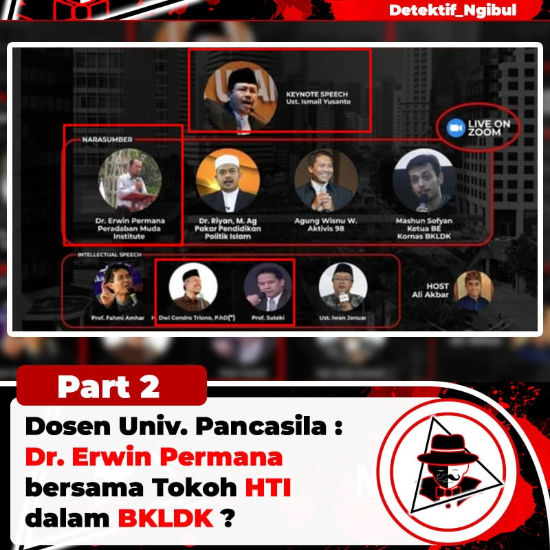 Erwin Permana menjadi salah satu narasumber dalam sebuah acara yang di adakan oleh organisasi sayap HTI yaitu BKLDK Bersama dengan para tokoh petinggi HTI yaitu Ismail Yusanto dan Prof. Suteki dan Dwi Condro Triono.
