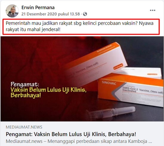 selain aktif dalam mengikuti acara yang diadakan oleh organisasi sayap HTI, Erwin permana membuat sebuah dugaan yang mengatakan pemerintah menjadikan masyarakat sebagai kelinci percobaan oleh pemerintah terkait vaksin Covid-19.