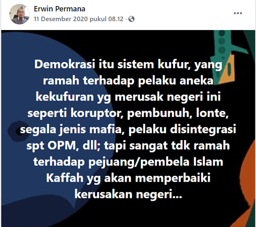 Erwin permana memojokkan sistem demokrasi dan menyebutkan demokrasi adalah sistem kufur. Ilmu Bapak Erwin selama sekolah dulu kemana ya?kok bisa-bisanya bilang demokrasi itu sistem kufur.