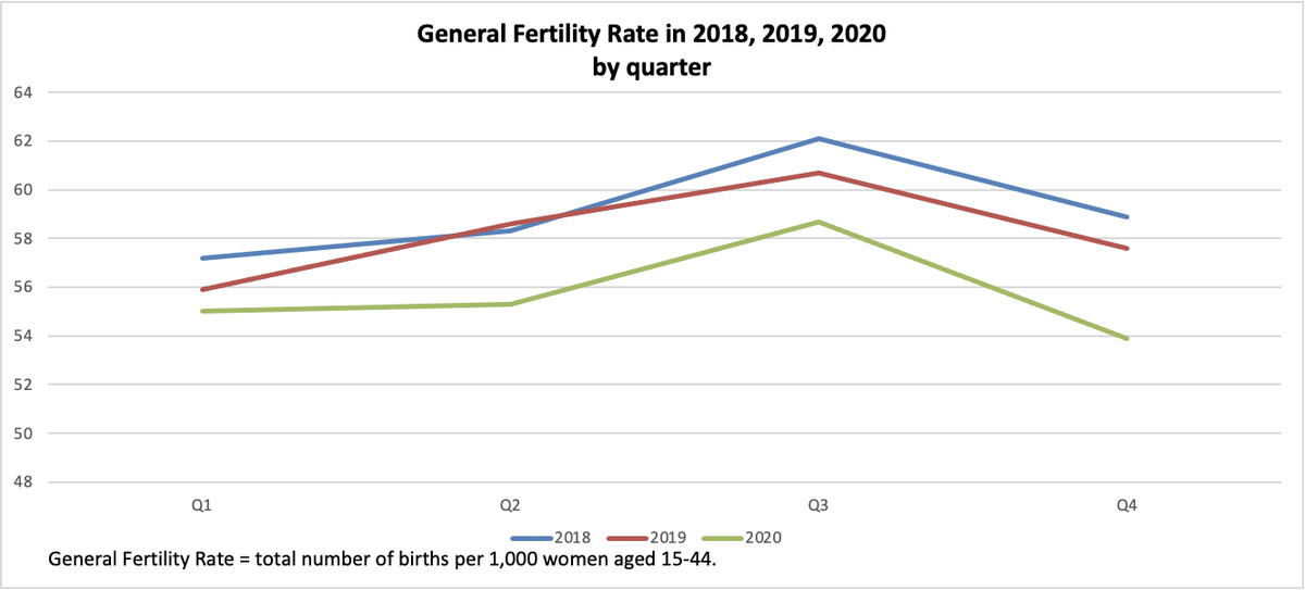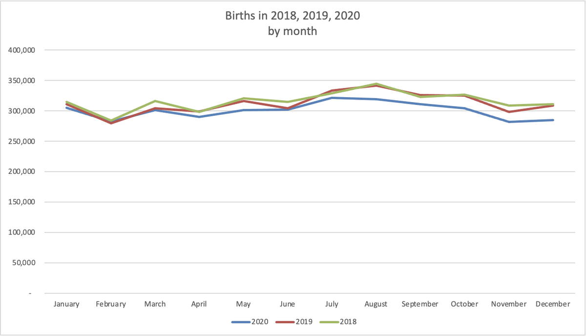 The provisional CDC data on births by month over the past three years suggest that births in 2020 started to really drop off around July/August. If true, would imply that conceptions dropped off even before the pandemic began (or maybe more terminations, or something else?).