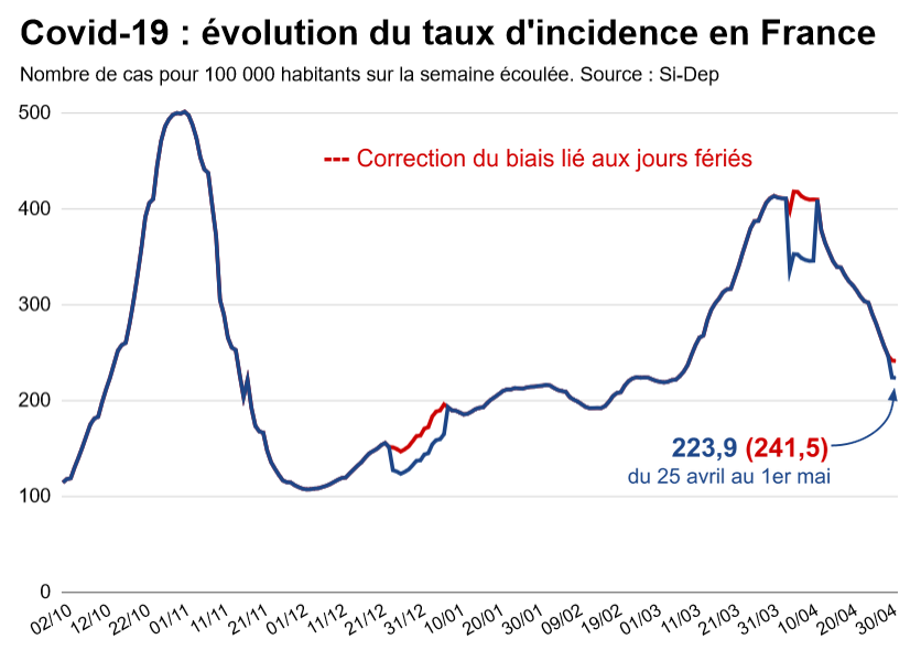 Le taux d'incidence en France chute à 223,9 (nombre sous-estimé en raison du 1er mai).