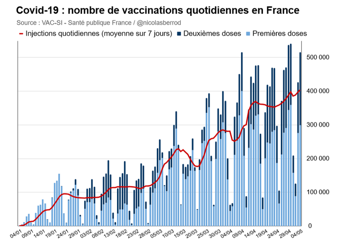 Pour les 20 millions le 15 mai, tout pourrait se jouer ce samedi et jeudi prochain. Si peu de vaccinations étaient réalisées ces deux jours fériés, cela risquerait de trop compenser de grosses journées entre-temps. #Macron l'a d'ailleurs bien compris.