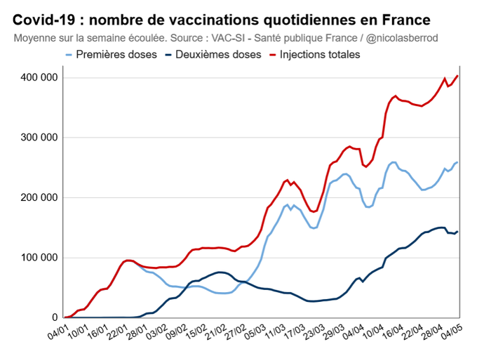 La barre des 400 000 vaccinations réalisées chaque jour (en moyenne sur la semaine écoulée) est dépassée pour la première fois. 260 000 d'entre elles sont des premières injections, là aussi c'est le plus haut niveau jamais atteint. 3/4