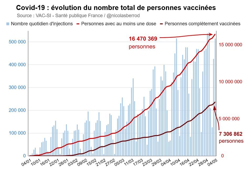 Au 4 mai, près de 16,5 millions de personnes ont reçu au moins une dose de vaccin. 7,3 millions d'entre elles sont complètement vaccinées (2 doses, une seule dose avec Janssen ou en cas d'antécédent de #Covid, 3 doses en cas d'immunodépression sévère). 4/4