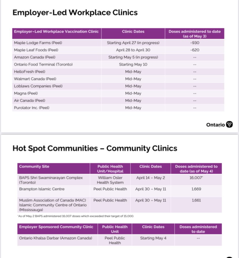 NEW: Ontario now estimates that 65% of those 18+ will be offered first vaccine dose by end of May. The province will also start giving Moderna in up to 60 pharmacies in hotspots of Durham, Hamilton, Ottawa, Windsor and York likely by this weekend #onpoli