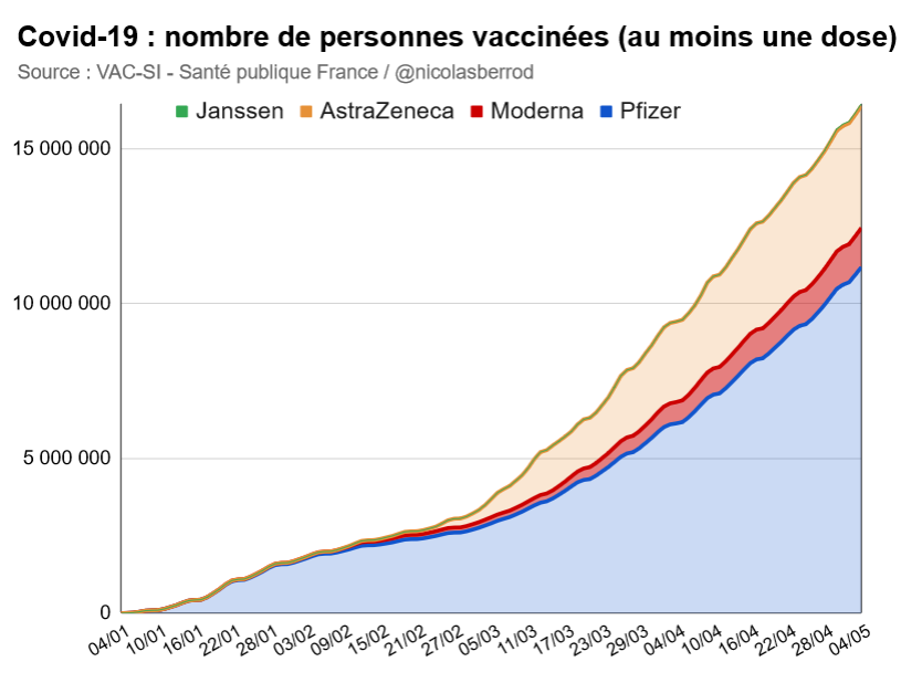 Depuis le début de la campagne de vaccination, près de 4 millions de personnes ont tout de même reçu une première dose de vaccin #AstraZeneca, sur un total de 16,5 millions de primo-vaccinés (au 4 mai). 6/6
