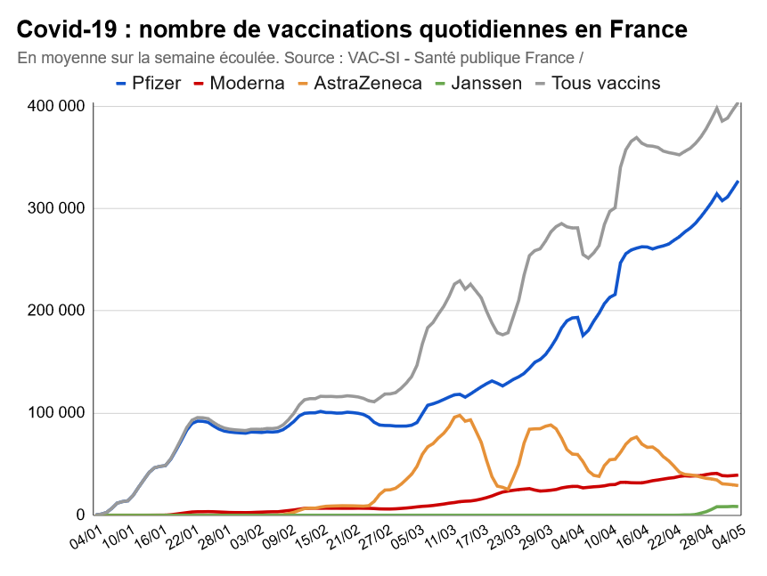 Chaque jour (en moyenne sur la semaine écoulée), moins de 25 000 personnes reçoivent désormais une première dose de vaccin #AstraZeneca. C'est trois fois moins que mi-avril. Tous vaccins confondus, 260 000 personnes reçoivent une première dose chaque jour. 2/6