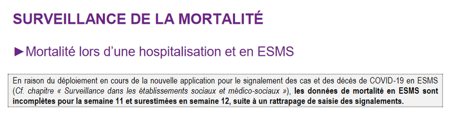 Concernant la forte augmentation des décès en Ehpad déclarés quotidiennement fin mars, Santé publique France avait expliqué qu'il y avait eu un "rattrapage de saisie des signalements" une fois le nouveau logiciel mis en place. 4/4