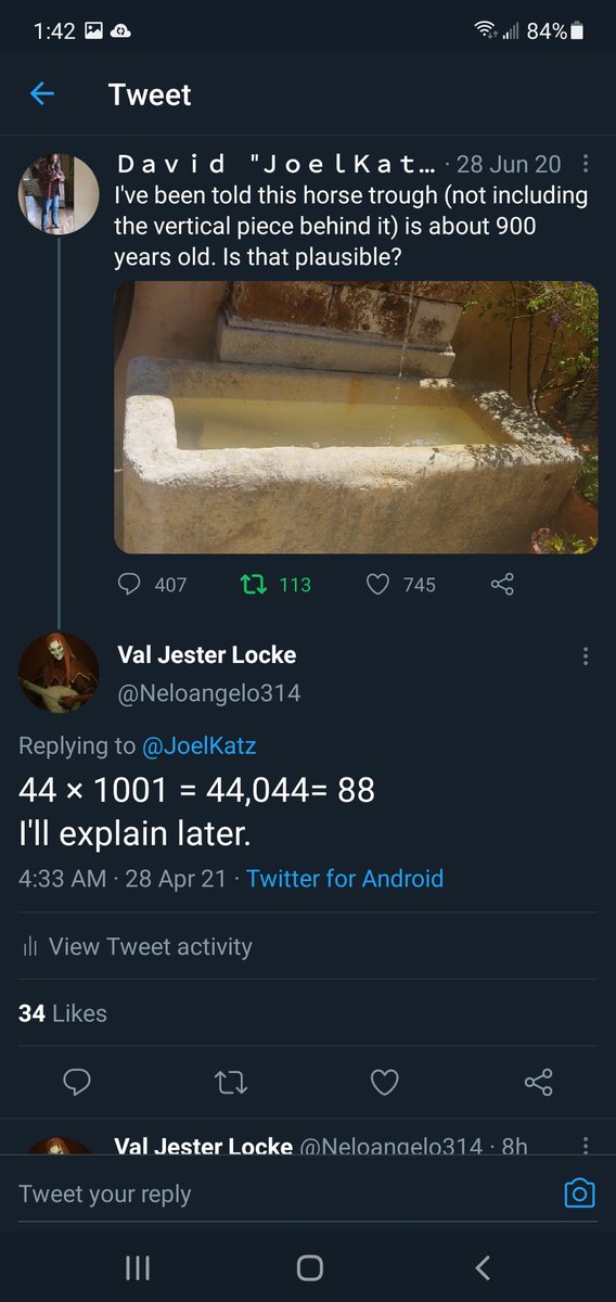 post with a 11:8 time with Kathy Bates as a gif. Her birthday is also June 28th like Elon's and the time is 88 again. Take the conversion I showed you of 9/118/5. Multiply each individual numer. 9×11×8×5=3,960. Like 369 tesla or David's patent. Not only that, check the year of