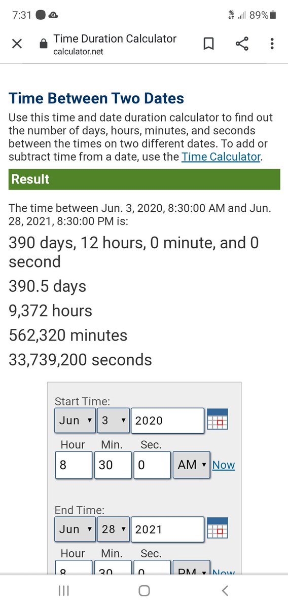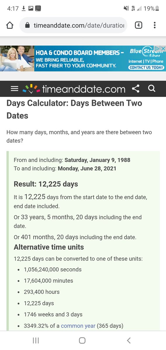 Time between 1/9/88 and 6/28/21 is 12,225 days. Simply add 1 to 5. 222-6 this is also 6-6. 33 years ago and 401 months ago or 41. 41 like 4/1. I laughed when I saw 88 days from 4/1 was June 28th. Like what are the chances?