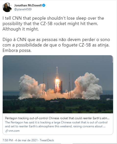 "Digo à CNN que as pessoas não devem perder o sono com a possibilidade de que o foguete CZ-5B as atinja. Embora possa" Jonathan McDowell cnn.com/2021/05/04/pol…