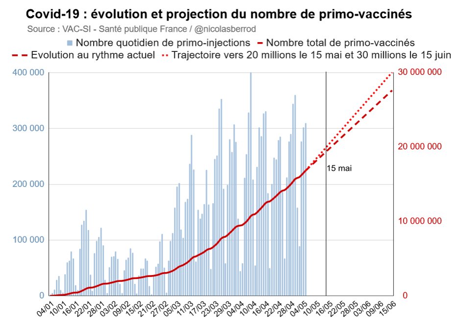 Ce rythme des primo-injections sur la semaine qui vient de s'écouler ne serait cependant pas suffisant pour atteindre les 20 millions de primo-vaccinés le 15 mai et les 30 millions le 15 juin. Il faudrait pour cela être à 320 000 par jour (en moyenne). 4/