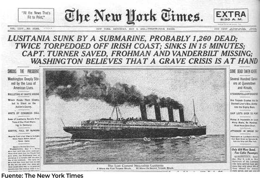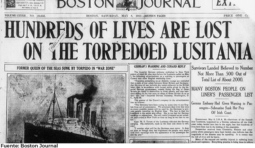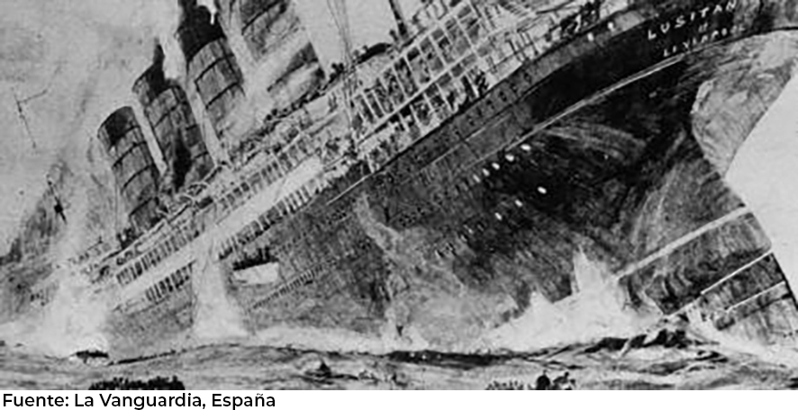 En 1915, el ‘Lusitania’, era considerado el buque de transporte de pasajeros más veloz y desafiando la batalla submarina que se vivía en las costas de Europa, zarpó de Nueva York con rumbo a Inglaterra, el 1 de mayo de 1915.
