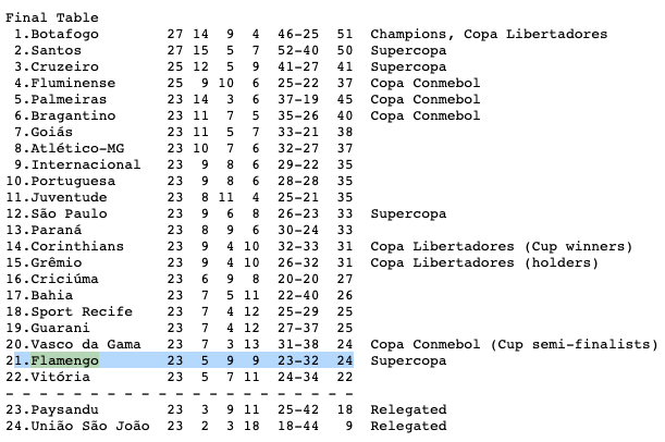 Realmente, o Flamengo terminou em 21º, eram 24 times na primeira divisão, seis pontos à frente do 23º e rebaixado Paysandu. Ou seja, nas últimas rodadas já havia escapado matematicamente do menor risco de queda. 7/11