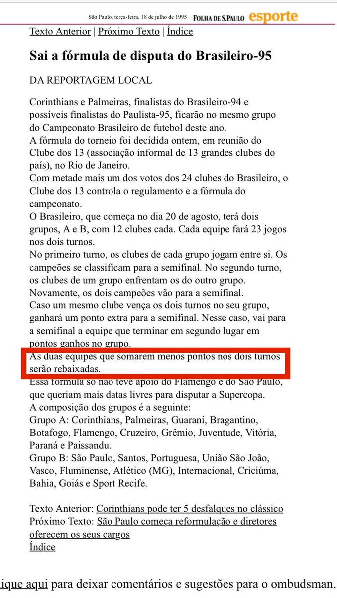 Mas afinal, a CBF mudou o regulamento? Matéria da Folha de S. Paulo de 18 de julho de 1995 apresentando o campeonato brasileiro que estava por começar (a primeira rodada foi em 19 de agosto) registrou em seu oitavo parágrafo: 9/11