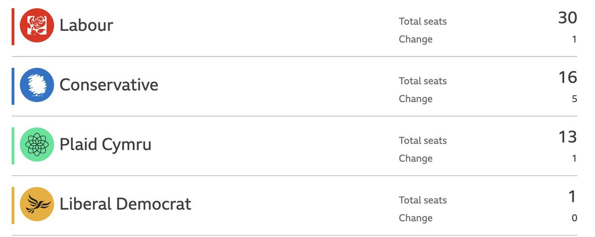 🇬🇧 En Gales ganan representación los laboristas con 30 escaños de 60 (+1), los conservadores (+5) y los nacionalistas de Plaid Cymru (+1) ante la desaparición del UKIP.