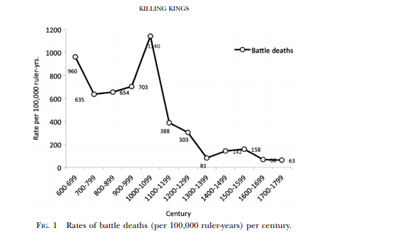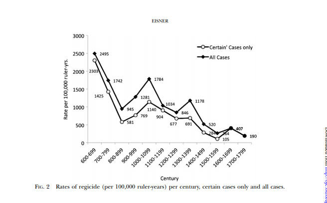 Manuel Eisner is an historian of homicide who had the idea to use rates of regicide to infer homicide rates among less important people before records became available ~`1200. The worst time to be a European king was the 7th century: citeseerx.ist.psu.edu/viewdoc/downlo…
