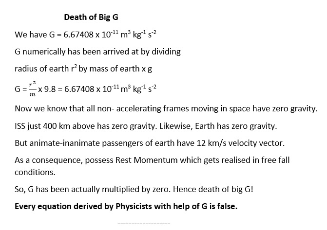 Cont- 4. 1st Law of motion clearly states that non-accelerating bodies r at rest. So Earth & other bodies have 0 gravity. 5. From times immemorial ships have been moving in contravention to 2nd & 3rd Law. 6. Since g is zero big G being product of earth parameters is zero.