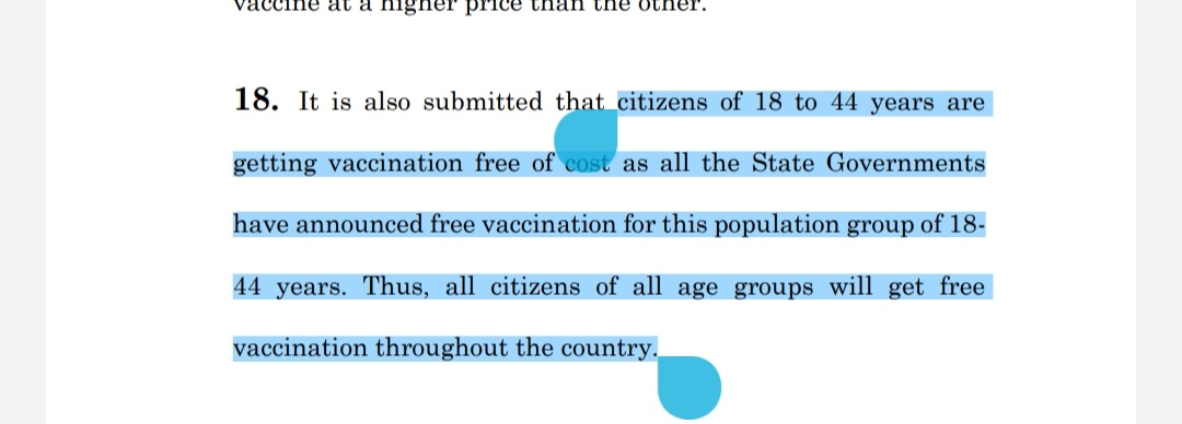 Central govt has also told the court that all citizens are getting free vaccine since all States have announced free vaccination between age group 18-44.