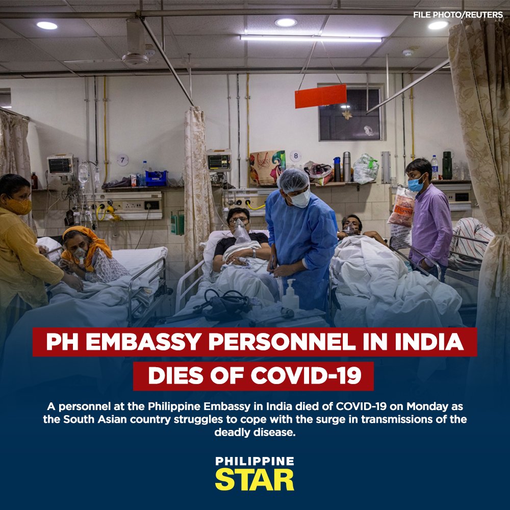 A personnel at the Philippine Embassy in India died of COVID-19 on Monday as the South Asian country struggles to cope with the surge in transmissions of the deadly disease.
