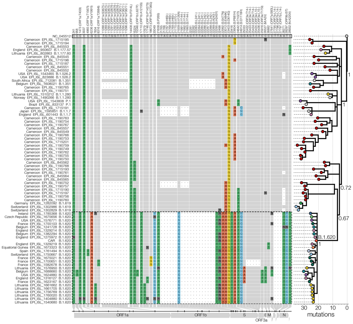 What surprised us is that even then B.1.620 doesn't have close relatives - Swss B.1.619 (also from Cameroon it seems) & some genomes sequenced in Cameroon (thanks to Ahidjo Ayouba) are closest, leaving the B.1.620 branch with ~20 mutations that aren't broken up by relatives. 7/12