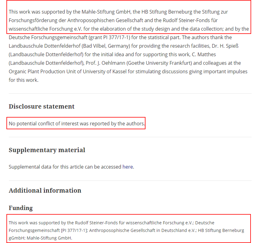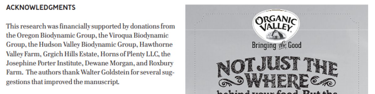 Troisième source, un papier de Endelman et al de 2014, qui n’est pas sorti dans une revue scientifique, donc non révisé par les pairs, qui plus est financé par le lobby biodynamique, ok lol next. ->💩 👇